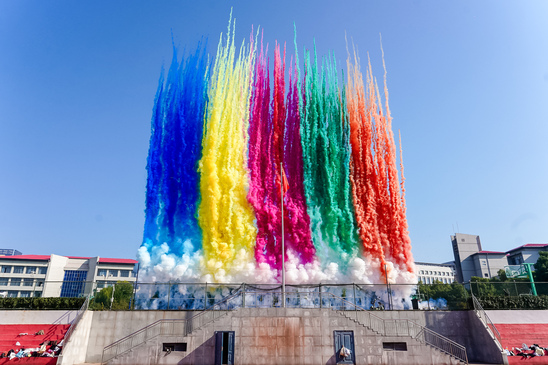 校党委书记杨鲜兰宣布学校2025年体育文化节暨秋季运动会正式开幕。看台上方旋即燃起五色烟花,如祥云般映照整个体育场。